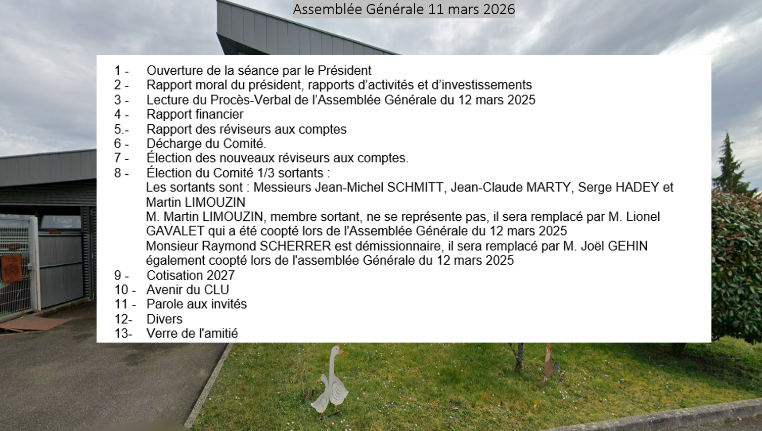 56 membres étaient présents, 16 ont donné un pouvoir, le maire Yves Goepffert, de Wittelsheim et deux adjoints étaient présents, la municipalité de Staffelfelden s’étant excusée pour raison de réunion électorale, le Conseiller de la CEA, Pierre Vogt était également présent, ainsi que, le directeur du Crédit Mutuel de Wittelsheim. A noter, l’organisation cette année de Portes ouvertes le dimanche 07 juin 2026, marquant les 20 ans du Clu Bois et Fer dans notre nouvelle structure et les 62 ans de la création du Clu Marie-Louise par les Mines de Potasse d’Alsace le 01 décembre 1964.
